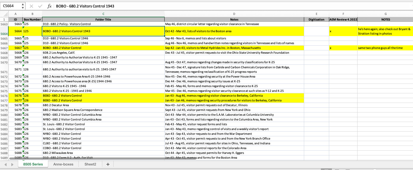 With my research appointment coming up quickly, the next task was to review the finding aid, an Excel spreadsheet of 7,700 lines, one line for each folder, with titles and descriptions, and select the files I would review. To manage this task, I searched for keywords such as ‘Stone and Webster’, ‘Tennessee Eastman Corporation’, ‘Boston’, ‘Oak Ridge’, ‘cubicles’, ‘procurement’, ‘expediting’, ‘deaths’, and ‘insurance’. Procurement and expediting because the information on his death certificate, and in the documents from the Department of Energy (DOE) indicates he was a field expediter for the Tennessee Eastman Corporation at the time of his death, and expediting because it is a part of procurement. Stone and Webster, because he worked for Stone and Webster before he worked for Tennessee Eastman Corporation, and cubicles, because of his frequent trips to Pittsfield and Springfield, Massachusetts, where most of the parts that made up the calutron cubicles were made. Boston, because that is where the Manhattan Project office for the New England area was located. And the last two, death and insurance, were just in case there was information on deaths reported and insurance payments made in these files.