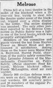 Melrose participated in a metropolitan-wide blackout held on March 31, 1942, which covered 600 square miles, making it hard for planes or U-boats to pinpoint cities and the coastline. Air Raid and blackout testing continued throughout the war.